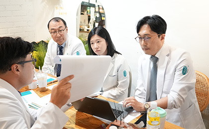 피부질환의 증상 및 정확한 원인분석을 위해 ‘체계적인 문진표와 진단기기를 활용한 데이터분석’과 ‘전담 주치의 1:1 상담을 통한 종합 분석’을 진행하여 피부질환은 물론, 체질, 성향, 생활습관까지 정확하게 분석합니다.